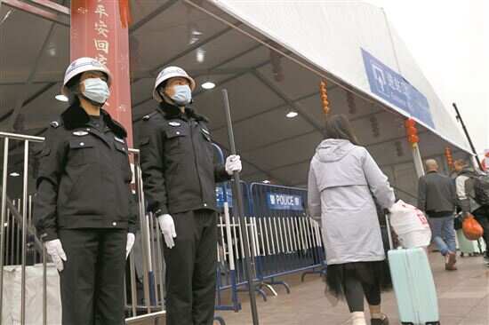 ■火车站广场上,负责安保的工作人员在进站口站岗执勤。