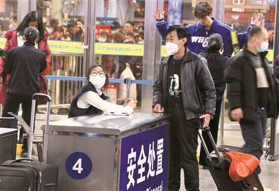 ■进站口安检处,一名工作人员正在对经过安检的旅客进行引导和说明。