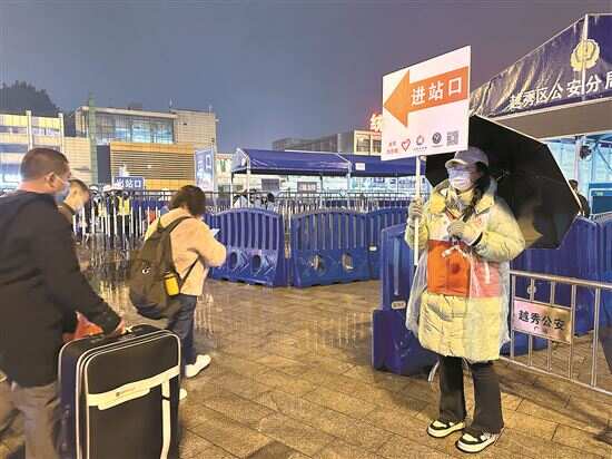在西广场蓝色水马围起来的进站口,一个身穿红白相间马甲,戴白色帽子,举着“进站口”牌子的志愿者显得格外醒目。短短五分钟内,她就接连回答了五个问题:这里是广州火车站吗?从这里进去吗?哪里有厕所?地铁在哪里?到哪里买火车票?寒风里,她耐心回答各种提问,得到了不少旅客的认可。