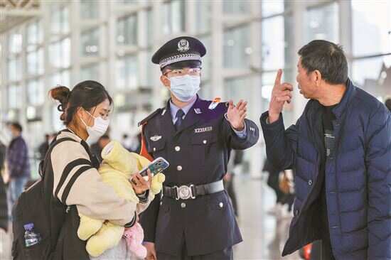 春运开始后,广州火车站一直处在繁忙状态。地铁站客流量更是位居广州所有枢纽地铁站之首。从1月24日上岗以来,这已经是胡珊连续在岗的第四天。新快报记者采访她时已经约晚上7点了,而她从下午2点就上岗了。因为当天前来提问的旅客众多,中途她只短暂休息了两次。