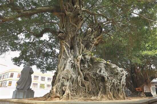 尤为震撼的是,古树树干被气根包围,呈三角形状,需十来人才能合抱。基部盘根错节,凹凸崎岖处,似小山包;扁平处,如乘风战舰;高耸处,若烽火台……这就是大名鼎鼎的“郑成功招兵树”。
