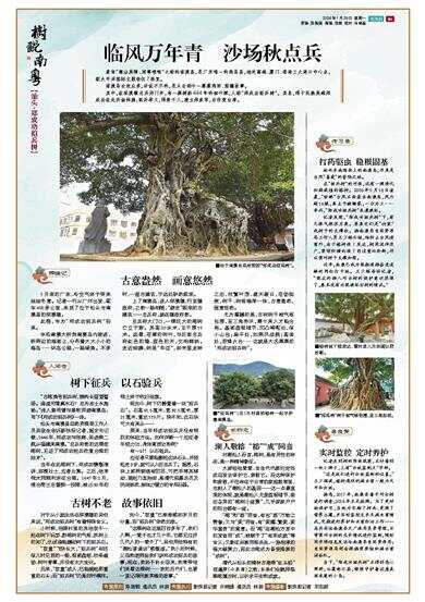 据悉,2017年,南澳县着手对古树进行调查,2018年正式挂牌。为了更好地保护它,当地为它砌了树池、更换了营养土壤,并实时监控生长及病虫害情况,定期进行养护和虫害防治工作——总兵府由南澳县文广旅局负责管理,日常需对古树的生长情况进行监测,随时同步将信息发送给南澳县自然资源局;自然资源局则会根据需要组织病虫害消杀队。