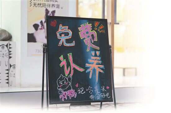 ▲广州天河区某连锁宠物店门口摆放着“免费认养”的牌子。