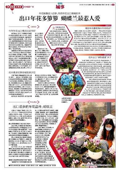 记者从广州海关了解到,今年1月1日-1月12日,广州海关关区年花年桔主要出口地(佛山顺德、广州荔湾)出口年花年桔约761.8万株,品种主要包括蝴蝶兰、海棠、年桔、富贵竹等,其中出口最多的年花品种是蝴蝶兰。