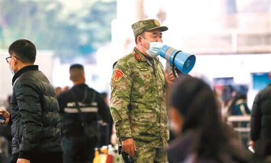 ■在广州火车站地铁出站口,一名工作人员手持喇叭,对进入火车站广场的旅客进行疏导。 新快报记者 夏世焱/摄