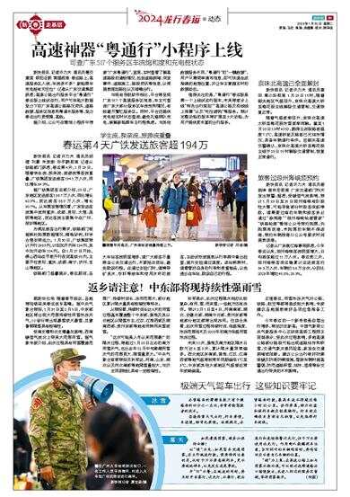 今年春运的一个新形势是自驾出行增多,将创历史新高。中国气象局公共气象服务中心正研级高级工程师王丽娟表示,受此次过程影响,多地高速公路部分路段可能出现道路结冰和积雪,交通气象灾害风险高,易发生交通拥堵或阻断。建议公众出行做好防寒保暖及防滑防摔措施,驾驶车辆时提高警惕,防范道路积雪、结冰、湿滑等给交通出行带来的不利影响。