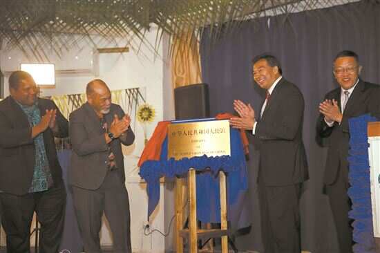 当地时间1月29日晚,中国驻瑙鲁使馆在瑙鲁岛东南部的一家酒店内举行复馆仪式。中国政府代表、国家国际发展合作署署长罗照辉和瑙鲁外长安格明共同为使馆揭牌。