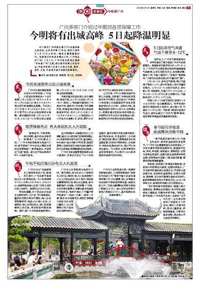 发布会上,广州市气象局副局长肖伟军通报了春节期间广州天气的预测情况。根据现有气象资料分析,2月1日-4日,广州的天气主要受高空波动和偏南暖湿气流影响,以多云到阴天为主,有轻雾或雾,偶有小雨,气温小幅回升,“回南天”继续维持,“大家无论在家还是出行尽量关好门窗”。