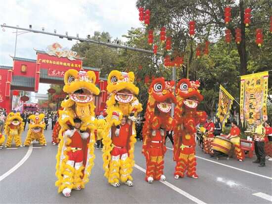 上午10时,来自白云区的三元里醒狮武术团在主牌楼下进行精彩的舞狮贺岁表演,鼓声激荡,醒狮威武,寓意龙马精神、吉祥如意。走进花市,“古韵花市、未来花市”两大主题街区,多元风格融合碰撞,年花、挥春、互动打卡、汉服体验等档位应有尽有。