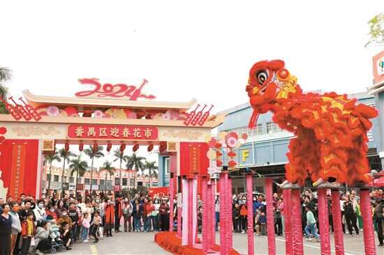 随着花市鸣锣,迎春花市正式“开门迎客”。跟随着舞龙走进花市,三头醒狮威风凛凛站在高桩上,开启精彩的高桩舞狮表演。“和美番禺,龙马精神”,醒狮口吐祥瑞,把新春祝福送给大家,在表演结束后市民纷纷过来摸狮头,寓意新年“鸿运当头”,好运连连。