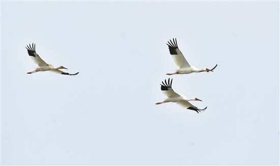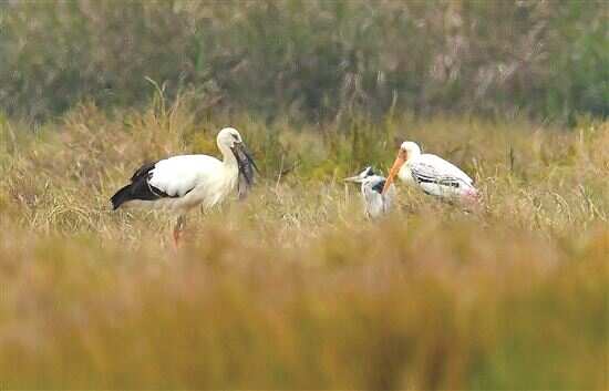 新快报讯 记者王彤 通讯员林荫报道 日前,记者获悉,摄影爱好者刘小鹰在汕尾市拍摄到白鹤、彩鹳和东方白鹳同时出现的画面,当日东方白鹳数量高达100多只。据省林业局介绍,这3种候鸟都是国家一级保护野生动物,其中白鹤尚属于汕尾首次记录,而“两大一小”的白鹤同框画面在省内也较为罕见。