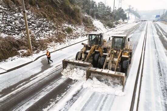 2月5日,在位于湖南省益阳市桃江县境内的S230桃江段,桃江县公路局工作人员调用除冰车铲除道路上的冰雪。
