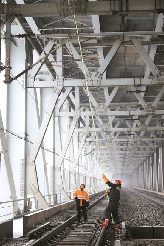 2月4日,在位于京广大动脉上的武汉天兴洲长江大桥上,武汉供电段工人在天窗期对铁路接触网设备进行除冰作业。