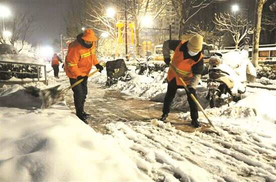 2月5日凌晨,江苏省淮安市环卫工人在城区主干道上清除积雪。