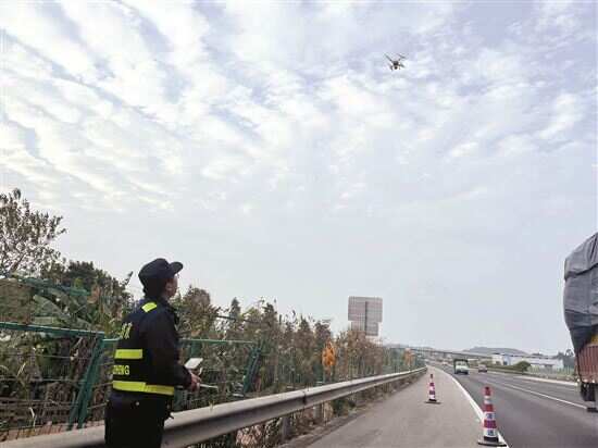 ■广清高速路政员使用无人机巡查道路通行情况。通讯员供图
