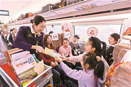 2月7日,G8次乘务员在车厢内向乘客推荐儿童图书。