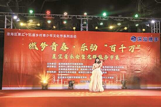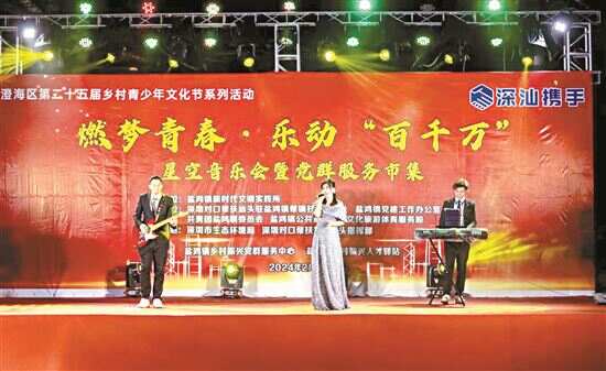 新快报讯 记者朱清海报道 岁末已至,年岁将启。为营造欢乐喜庆的新春氛围,展示活力满满、热气腾腾的乡村新形象,吸引广大青年投身“百千万工程”,2月7日(腊月廿八)晚上,在深圳市生态环境局和深圳对口帮扶协作汕头指挥部大力支持下,汕头市澄海区盐鸿镇在乡村振兴党群服务中心举办了澄海区第二十五届乡村青少年文化节系列活动——“燃梦青春·乐动‘百千万’”星空音乐会暨党群服务市集之乐队专场演出。