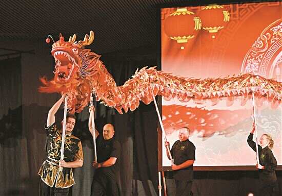 1月27日,中国文化爱好者在德国汉堡举行的春节联欢会上表演舞龙。