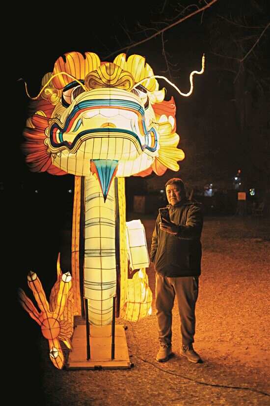 2月7日,一名男子在尼泊尔加德满都的灯展上自拍。