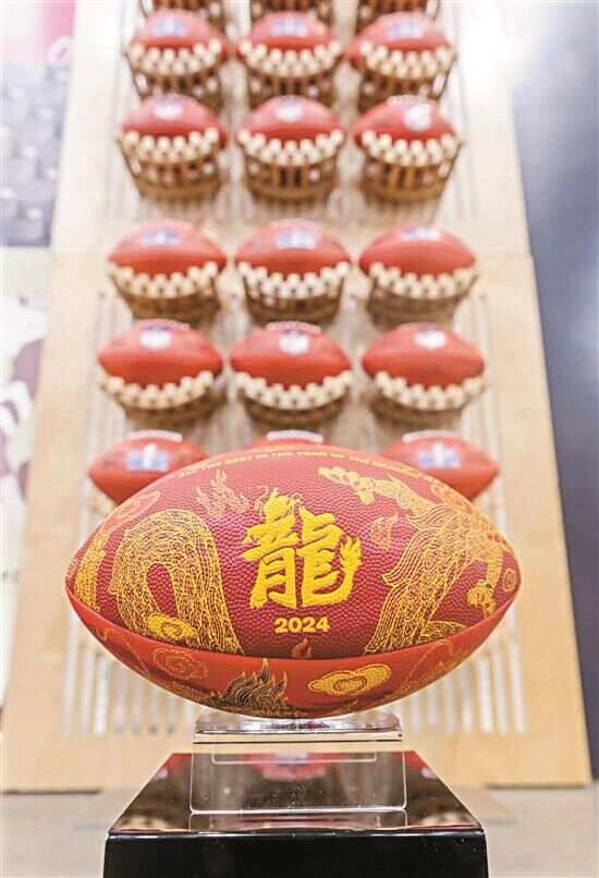 这是2月7日在美国拉斯维加斯拍摄的美国职业橄榄球大联盟(NFL)推出的“龙”标限量收藏版橄榄球。
