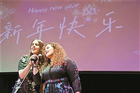 2月6日,在摩洛哥卡萨布兰卡,摩洛哥哈桑二世大学孔子学院举行2024年春节联欢会。这是摩洛哥学生在联欢会上演唱中文歌曲。
