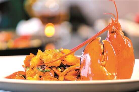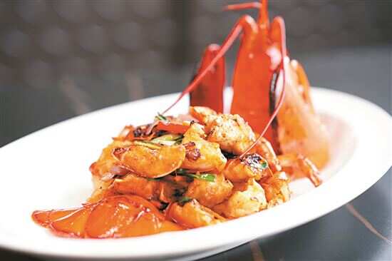 猛火爆香红葱头、紫洋葱、小葱,加入过了油的龙虾块爆炒,再加入鸡汤焖煮,待汤汁收干后勾芡,三分钟即可起锅。