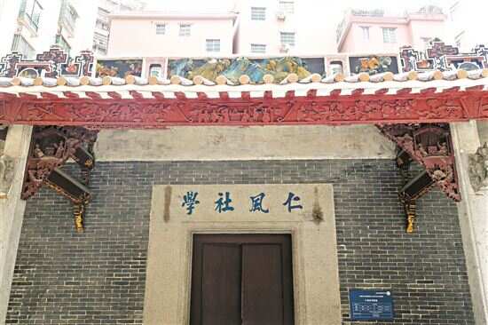 龙归墟的中心——仁风社学,是一座仿岭南广府祠堂形制的建筑,坐东朝西,始建年份待考,曾于清道光十八年(1838年)、光绪元年(1875年)、光绪十三年(1887年)重修,正门石额阴刻楷书“仁风社学”,上款“光绪元年重修”,落款依稀可辨“孙云”两字。该社学由南村、北村、柏塘、夏良、园下五乡共筹得八股资金建成,是龙归地区兴学育才、乡绅议事、乡村治安和调解纠纷的场所。
