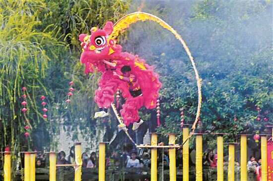 节目《雄狮攀登火焰山》是今年龙狮展演的一大亮点,在高低错落的水上梅花桩上特设了烈焰火圈,雄狮在距离湖面超过3米的梅花桩上闪扑回旋、倒挂金钩,360°转体腾空飞跃穿越火圈,动作惊心动魄,不容有失,难度系数创历年新高。