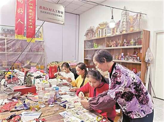 比起舞龙,潭山村的乞巧、飘色更有名。许伟麟带新快报记者走进综合文化中心一楼的乞巧工作室,只见非遗传承人潘少芬正带着几名小学生制作乞巧作品。70多岁的潘少芬细心地教导学生,一针一线,制作出“迷你版”的戏服、鞋子、公仔。“寒假期间,这几名学生每天都过来,跟着我把乞巧作品整个制作流程学了一遍,主要是培养他们的兴趣,为乞巧这门非遗技艺培养传承人。”潘少芬告诉记者,潭山村还开展乞巧进校园活动,她走进幼儿园、中小学为学生授课。