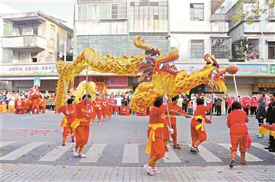 新春佳节,在化龙镇政府门口,来自潭山村的两条金龙“双龙出海”,精彩的表演吸引众多市民观看。