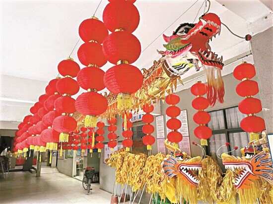 ■化龙镇潭山村综合文化中心一楼长廊挂着一串串红灯笼,以及一条长20多米的金色长龙。