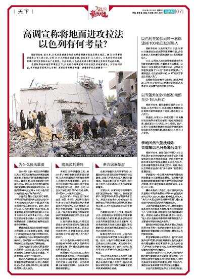 据新华社电 连日来,以色列连续袭击加沙地带南部城市拉法及周边地区。继12日军事行动造成上百人死亡后,以军16日又对拉法实施空袭,造成至少11人死亡。以色列针对拉法的军事行动引发国际社会广泛担忧。与此同时,以色列在北部与黎巴嫩真主党的冲突也在加剧。