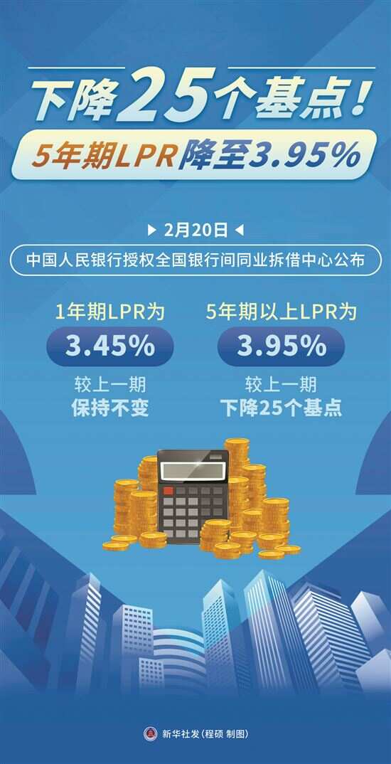 连续5个月“按兵不动”后,贷款市场报价利率(LPR)终于迎来下调。2月20日,中国人民银行授权全国银行间同业拆借中心公布,1年期LPR为3.45%,维持不变;5年期以上LPR为3.95%,上月为4.2%,较前值下行25个基点。
