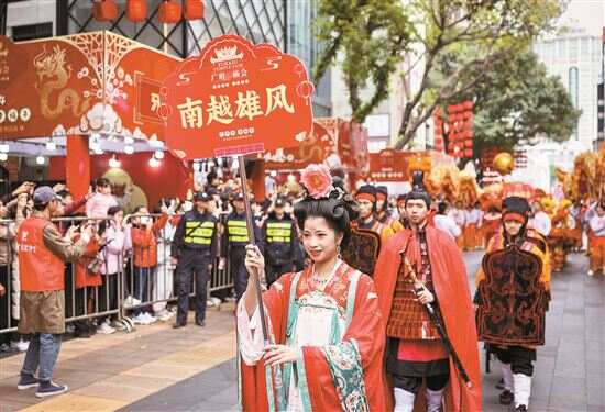 旋律如春风,吹拂百货高楼上悬挂的龙年灯笼,灯笼的红,映照在千年古道的玻璃罩,也映照在准备巡游的“南越雄风队”盾牌上。