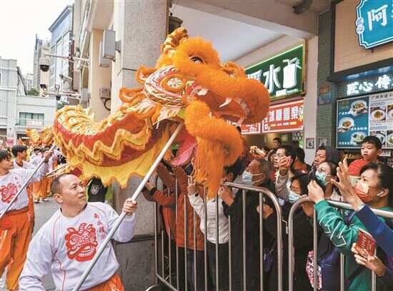“太幸运了,能看到庙会巡游,今年真是要行大运的节奏,瞬间感觉幸福无比!”有观众感叹。舞龙的队伍,不时伸出龙头和观众互动,引来欢呼此起彼伏;披戴甲胄的“金甲侠光队”(传统服饰爱好者),更是行走的合照打卡点。