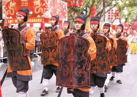 在本次广府庙会的民俗文化巡游中,首先出场的就是“南越雄风队”,据主办方介绍,“庄严震撼的队列,重现了两千多年前南越卫队的威武形象和飒爽雄风,卫队战服以汉代出土的南越王胸甲为原型,经考古研究和艺术加工而成”。