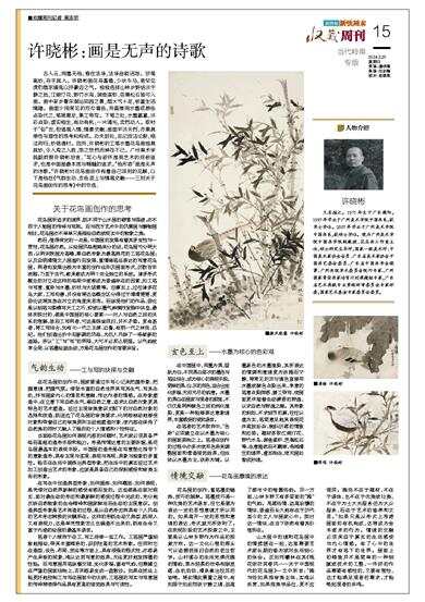 古人云,用墨无他,惟在洁净,洁净自能活泼。涉笔高妙,存乎其人。许晓彬画花鸟畜兽,少状牛马,更罕见虎豹鹿豕獐兔以抒豪迈之气。独独选择山林乡野恬淡宁静之地,江湖汀花、野竹水鸟、渊鱼溪虾、芭蕉松石皆可入画。画中家乡粤东潮汕田园之景,烟火气十足,极富生活情趣。画面少用常见的双勾填色,而直接用水墨或颜色点染代之,笔简意足,兼工带写。下笔之处,水墨氤氲,淡彩点染;虚实相生,有动有机;一片清光,奕然动人。取材于“俗”世,但借境入情,情景交融;画面平淡天然,亦兼具感性与理性的思考和构成。功夫到处,忘记技法论断,格法同归,妙悟通时。因而,许晓彬的工笔水墨花鸟画独具其妙,令人观之入胜,思之悠然而神往不已。广州美术学院副教授许晓彬坦言,“写心与叙怀是我艺术的终极追求,也是中国画最本质与精髓的追求。”他形容“画是无声的诗歌。”许晓彬对花鸟画创作有着自己深刻的见解,以下是他在《气韵生动、玄色至上与情境交融——三则关于花鸟画创作的思考》中的节选: