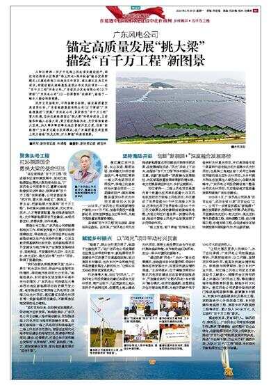 “在全面推进‘百千万工程’促进城乡区域协调发展中,坚决扛起能源国企勇挑大梁的使命担当。”广东风电公司党委书记、董事长杨海胜接受采访时表示,按照省委“百千万工程”决策部署,公司党委坚持“把方向、管大局、保落实”,聚焦主责主业,把新能源大发展和“百千万工程”、乡村振兴战略结合起来,优化资本、技术、人才等要素配置,稳步推进海陆风电、光伏等新能源项目开发建设,实现优势互补、资源共享、协作共赢。