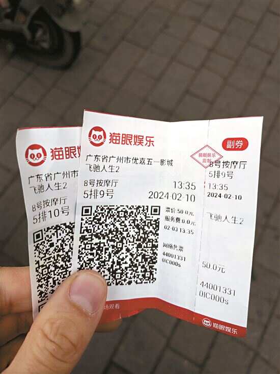 据郭女士介绍,她2月3日上午提前购买了大年初一(2月10日)13时35分的《飞驰人生2》的两张电影票,电影院为广州市优嘉五一影城(四季天地店),郭女士的线上购票平台为支付宝App中的“猫演”小程序。(经支付宝账单详情显示,该笔订单消费金额为92元,最终收款方为芒果科技(湛江)有限公司)。2月3日当天13时30分左右,由于刚好在电影院看当天的另一场电影,郭女士索性将影票提前打印出来。后来才发现时间冲突,于是在2月3日下午,郭女士向平台和影院两方进行咨询看能否进行退改处理,改到上午10时10分的场次。