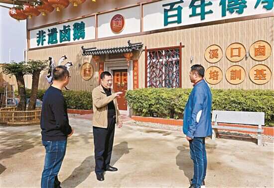 ■潮州市湘桥区农业农村局局长谢伟荣(中)到溪口卤鹅民俗体验园走访调研。