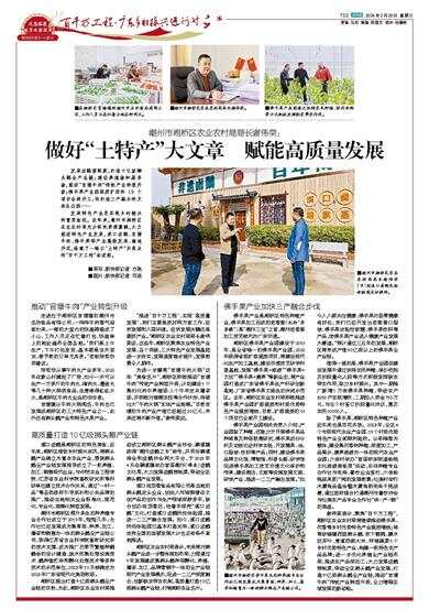 谢伟荣表示,聚焦“百千万工程”, 湘桥区农业农村局将继续推动佛手果、沉香等乡村优势特色产业提质增效;培育铁铺镇西陇狮头鹅、坎下鹌鹑、嫌水坑茶叶、意溪西都大米、坪埔蔬菜5个乡村优势特色产业,构建一批特色农产品品牌;进一步优化养殖全产业链布局,推进农产品深加工;大力发展卤鹅预制菜,带动全区狮头鹅产业发展,打造十亿级狮头鹅全产业链;推动“官塘牛肉”传统产业转型升级,全力增强区域发展的新动能。