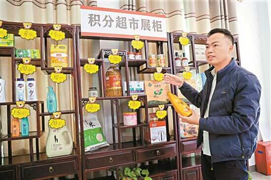 走进那霍镇水石村“积分超市”,香皂、洗衣液、水壶等日常生活用品琳琅满目,兑换专柜上每种物品都标着兑换所需积分,村民可以凭积分卡兑换生活物品。