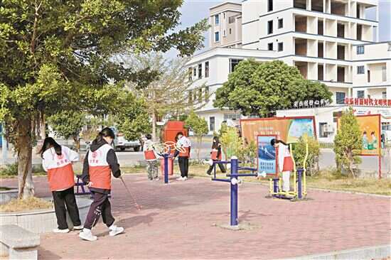 ■电白区电海街道安乐村,志愿者在广场内打扫卫生。