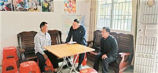 ■驻礼士镇工作队队长刘明一(中)到村民家中走访。