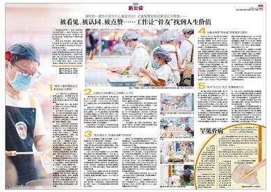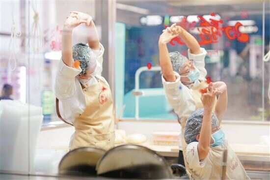 11:00左右,休息空当,大家停下手上的工作望向店长。“先做操,放松一下!”负责店铺日常管理的孙姓店长笑着邀请“骨友”阿丹领头,带领大家做放松操,然后歇息一刻钟。趁着喝水的空当,“骨友”倩倩告诉新快报记者:“这份工作是我最喜欢的,很多人看到我包饺子,尝到我包的饺子,都会竖起大拇指,我觉得这就是人生的价值。”