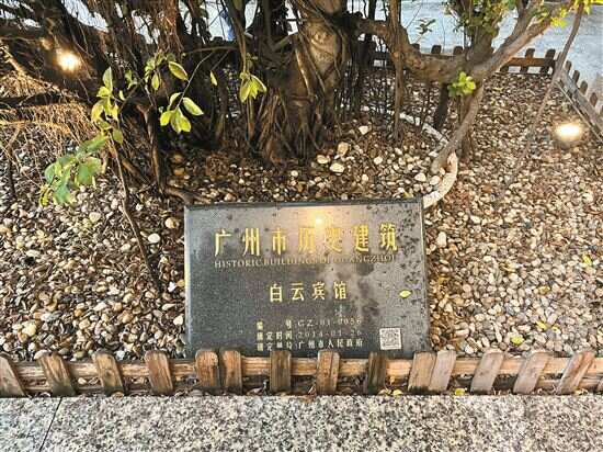 ■广州市政府确定的“广州市历史建筑 白云宾馆”标识牌位于宾馆正门西侧花基池。
