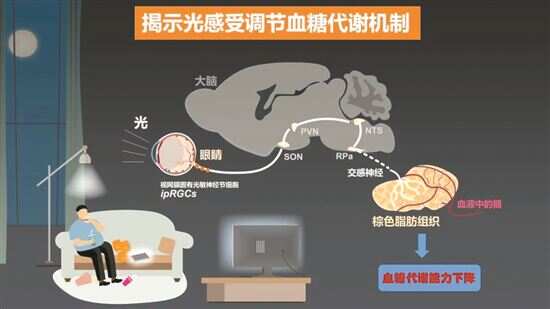 国内外多项公共卫生调查研究显示,夜间过多光暴露显著增加罹患糖尿病、肥胖等代谢疾病风险。中国科学技术大学薛天研究团队发现光暴露显著降低小鼠的血糖代谢能力。进一步研究表明,光同样可利用该机制降低人体的血糖代谢能力。