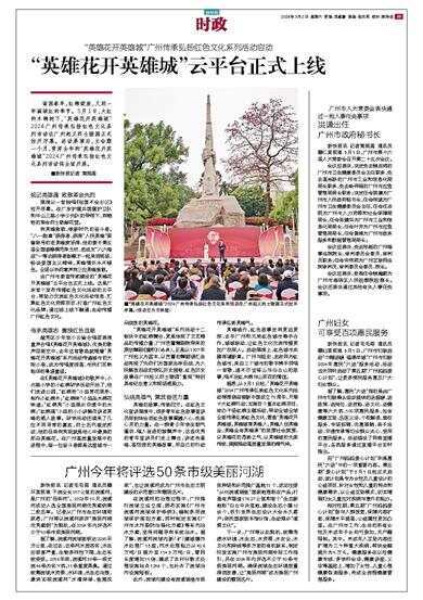 由广州市委宣传部建设的“英雄花开英雄城”云平台也正式上线。这是广东首个发布传播红色文化活动的云平台,将助力交流红色文化活动信息、汇聚红色文化资源项目、打造广州红色文化品牌,通过线上线下融通,生动传播广州红色文化。