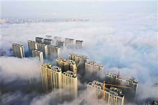当日,山西省运城市出现平流雾景观,建筑物在雾气中若隐若现。新华社发