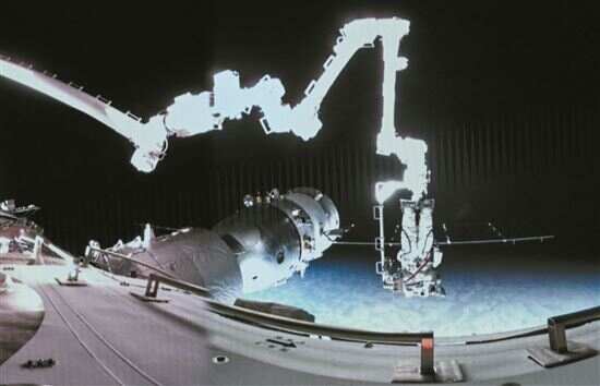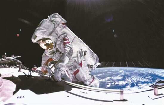 神舟十七号航天员江新林在空间站机械臂的辅助下进行舱外作业。